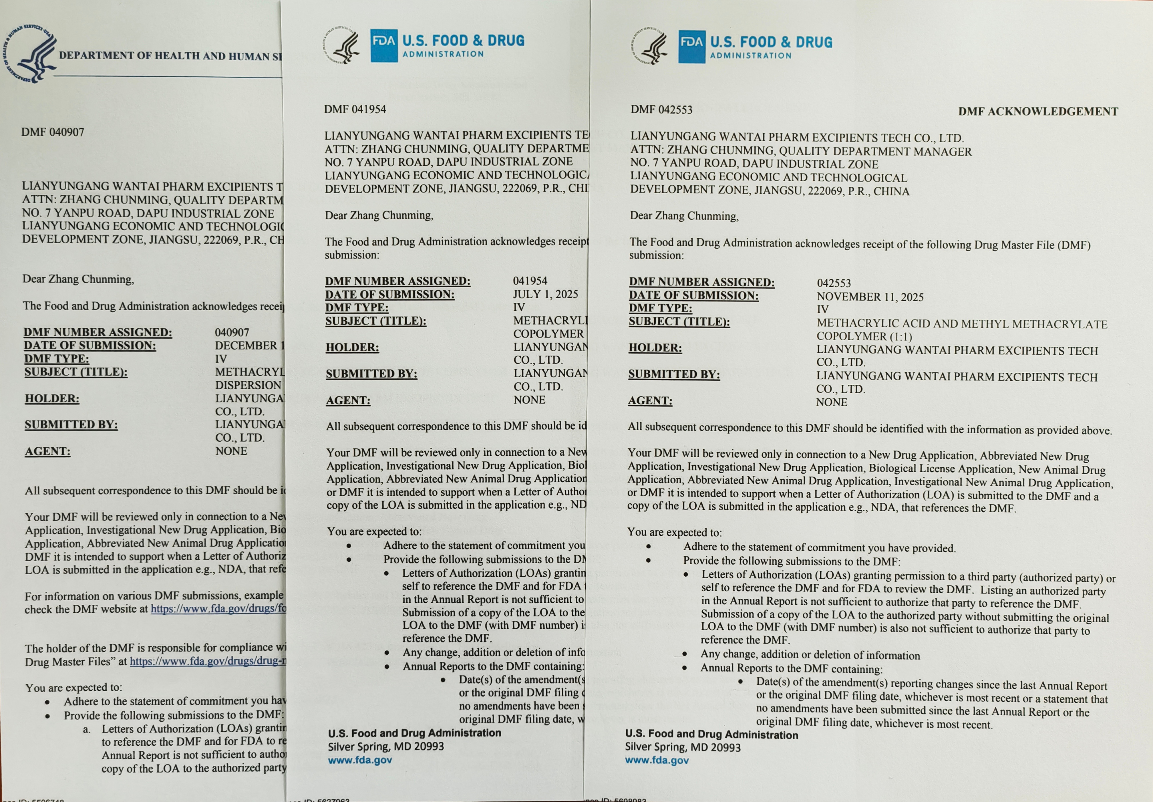 萬泰輔料3項產(chǎn)品完成DMF登記